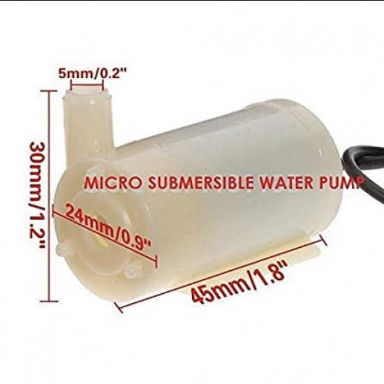 Micro DC 3-6V Micro Submersible Mini Water Pump is best for making DIY project and also used for Fountain Garden. This is a low cost, small size Submersible Pump Motor which can be operated from a 3 ~ 6V power supply. It can take up to 120 liters per hour with very low current consumption of 220mA. Just connect tube pipe to the motor outlet, submerge it in water and power it.