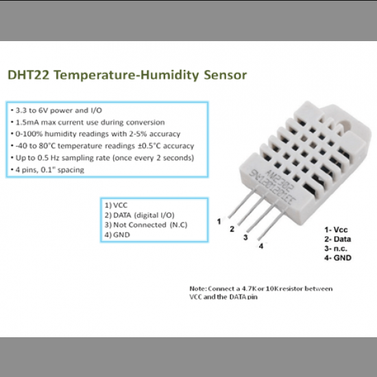 DHT22 Temperature and Humidity Sensor is a premium quality Humidity & Temperature Sensor from Techtonics. All DHT22 Digital Temperature & Humidity Measurement Sensor are manufactured by using quality assured material and advanced techniques, which make them up to the standard in this highly challenging field.