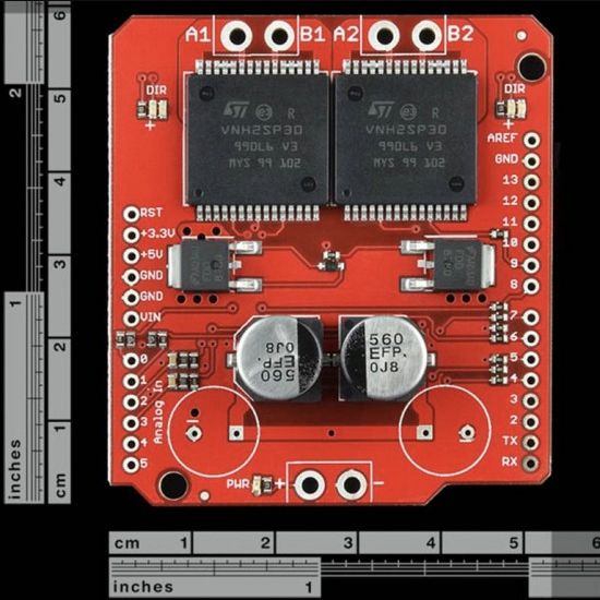 The Dual Monster Moto Shield VNH3ASP30 DC Motor Driver 2x14A (Peak 30A) is essentially a ramped up version of our Ardumoto motor driver shield. For this Monster Moto Shield, It is replaced the L298 H-bridge with a pair of VNH3ASP30 full-bridge motor drivers. VNH3ASP30 is the updated version of VNH2SP30