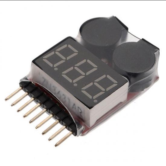 LiPo Battery Voltage Tester with Buzzer Alarm 1-8S combo is easy to use. It can save your model/batteries and investment. This is a new product combining all the voltage measurements with low-voltage alarm function. Li-Po Battery Voltage Buzzer Indicator: directly plug it into your operating battery, it will monitor the conditions of your battery all the time, so your batteries shall remain within safe operating voltage range at all times.