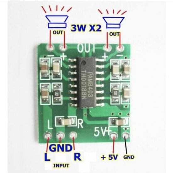 - 1 x PAM8403 3W Digital power Audio Amplifier Board USB DC 2.5V ~ 5V. Class D