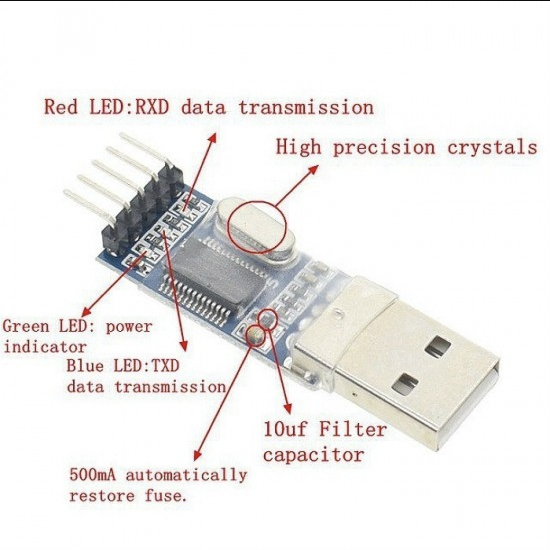 PL2303 - PL2303HX USB to TTL Serial UART Converter Module is a handy, low cost module. Adopt imported controller RS232 TTL, which can stabilize the flash with high-speed 500mA self-recovery fuse for protection.