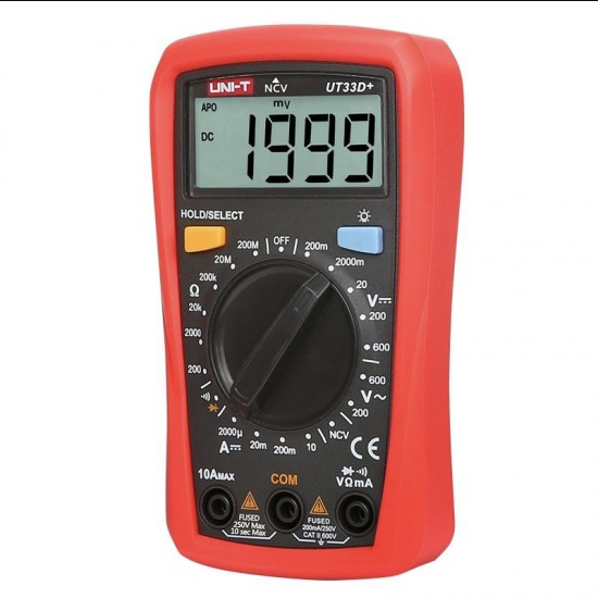 The new generation UT33+ series redefines the performance standards for entry-level digital multimeters. Our innovative industrial design ensures that these products can withstand 2 meters drop. The new LCD display layout provides a better user experience. Uni-T UT33D+ Palm Size Digital Multimeter ensures that users can work safely in CAT II 600V environment. Special features are, 2mF capacitance test (UT33A+); battery test (UT33B+); temperature measurement function (UT33C+); non-contact voltage (NCV) test (UT33D+).