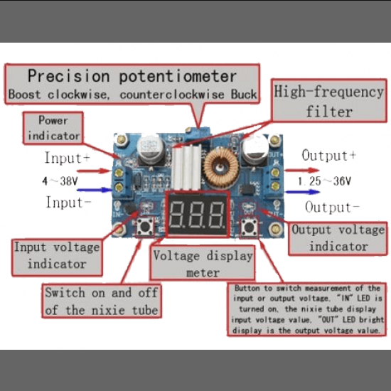 This module has an adjustable output Voltage and Current. It also works as a dedicated charger for Lithium Batteries (Li-Ion, LiPo) as it is capable of controlling voltage as well as current. Ex. 12V buck to 3.3V, 12V buck to 5V, 24V buck to 5V,24V buck to 12V, 36V buck to 24V, etc.