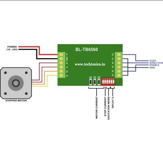The TB6560 stepper motor control circuit is the most commonly used current circuit, which can control a 2 phase motor (10 – 35VDC) with a maximum output of 3A. The TB6560 stepper motor control circuit is used for stepper motor control, CNC machine applications or precision mechanical systems.